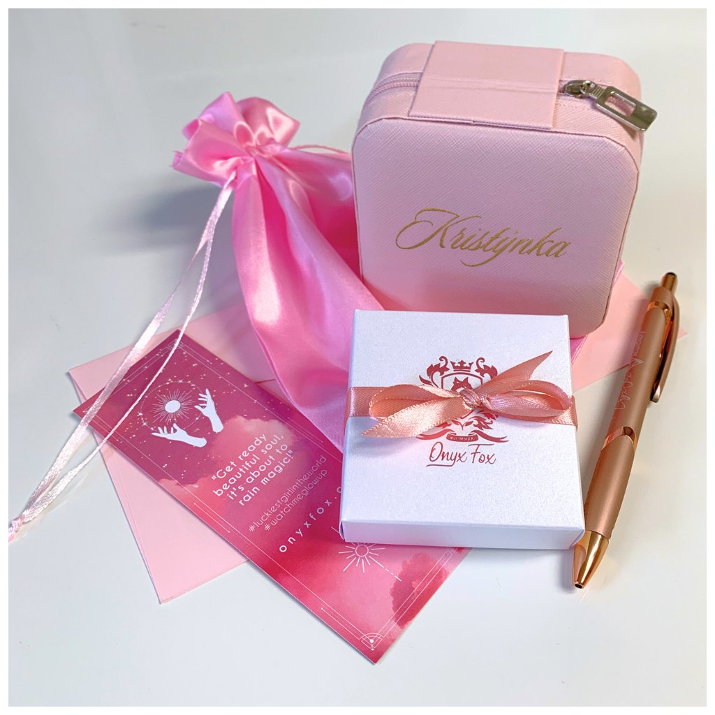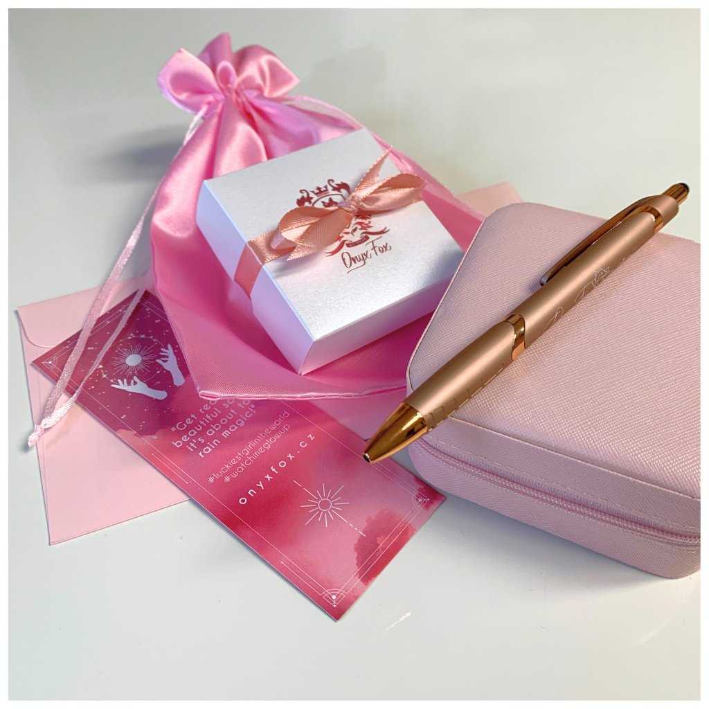 Toto dárkové balení obsahuje hravou, perleťově bílou krabičku s růžovým liščím logem Onyx Fox, vyrobenou naším místním dodavatelem tady v Jablonci nad Nisou, dále růžový saténový pytlíček se zdrhovací šňůrkou, do kterého krabička ukrývající šperk a převázaná mašličkou krásně zapadne. K tomu - pro radost i užitek - rose gold propiska s copper detaily a originální, oboustranná motivační záložka do knihy či plánovače. To vše ještě korunuje oblíbená šperkovnice, kterou je možné opatřit jménem či souslovím podle vašeho požadavku. Barva potisku je zlatá, na přání je možná i rose gold či stříbrná.