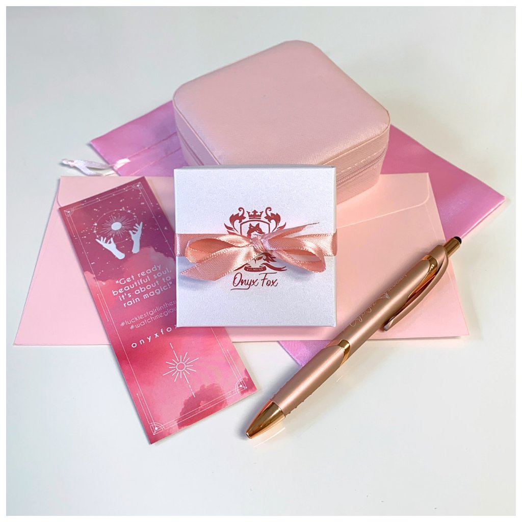 ✧ Dárkové balení obsahuje: krabičku na šperky, dárkový pytlíček, propisku, záložku do knihy a šperkovnici