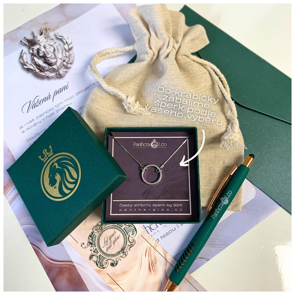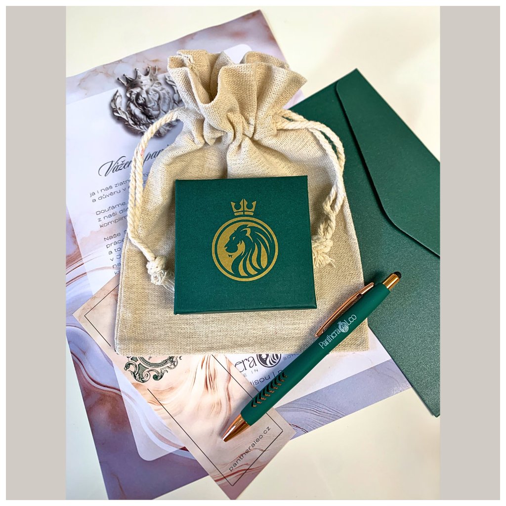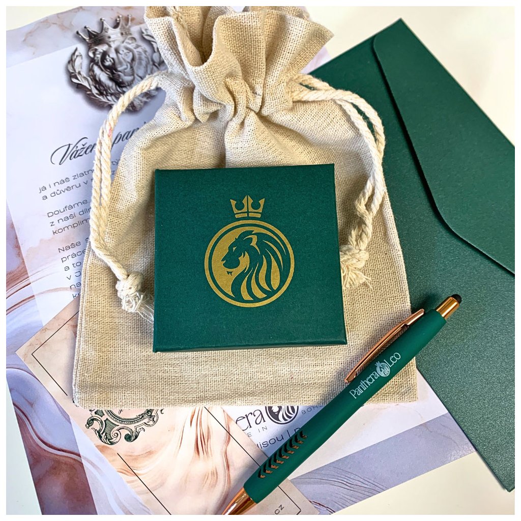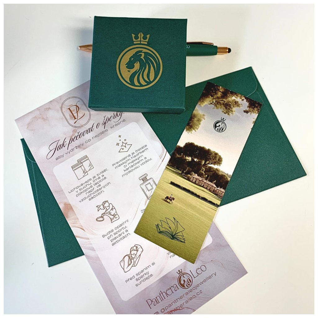 Toto dárkové balení obsahuje elegatní, smaragdově zelenou krabičku ze zlatým lvem a lněný pytlíček, do kterého krabička ukrývající šperk krásně zapadne. K tomu - pro radost i užitek - smaragdově zelená propiska s copper detaily a originální záložka do knihy.