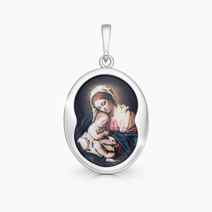 Oboustranný stříbrný přívěsek - medailonek – panenka Marie s miminkem. Srdce přívěsku tvoří medailonek z kvalitního porcelánu z malé české dílny.