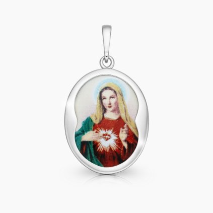 Oboustranný stříbrný přívěsek - medailonek – panna Maria se zářícím srdcem. Srdce přívěsku tvoří medailonek z kvalitního porcelánu z malé české dílny.