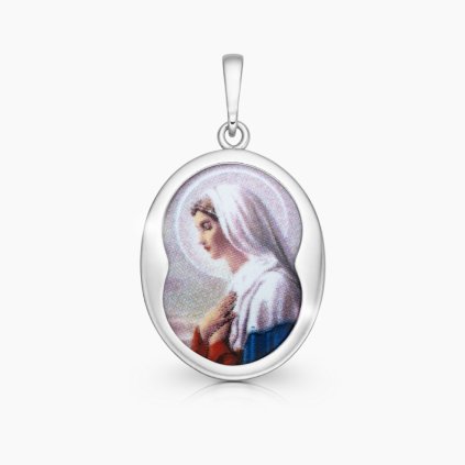 Oboustranný stříbrný přívěsek - medailonek – Panna Marie v bílém šátku se svatozáří. Srdce přívěsku tvoří medailonek z kvalitního porcelánu z malé české dílny.