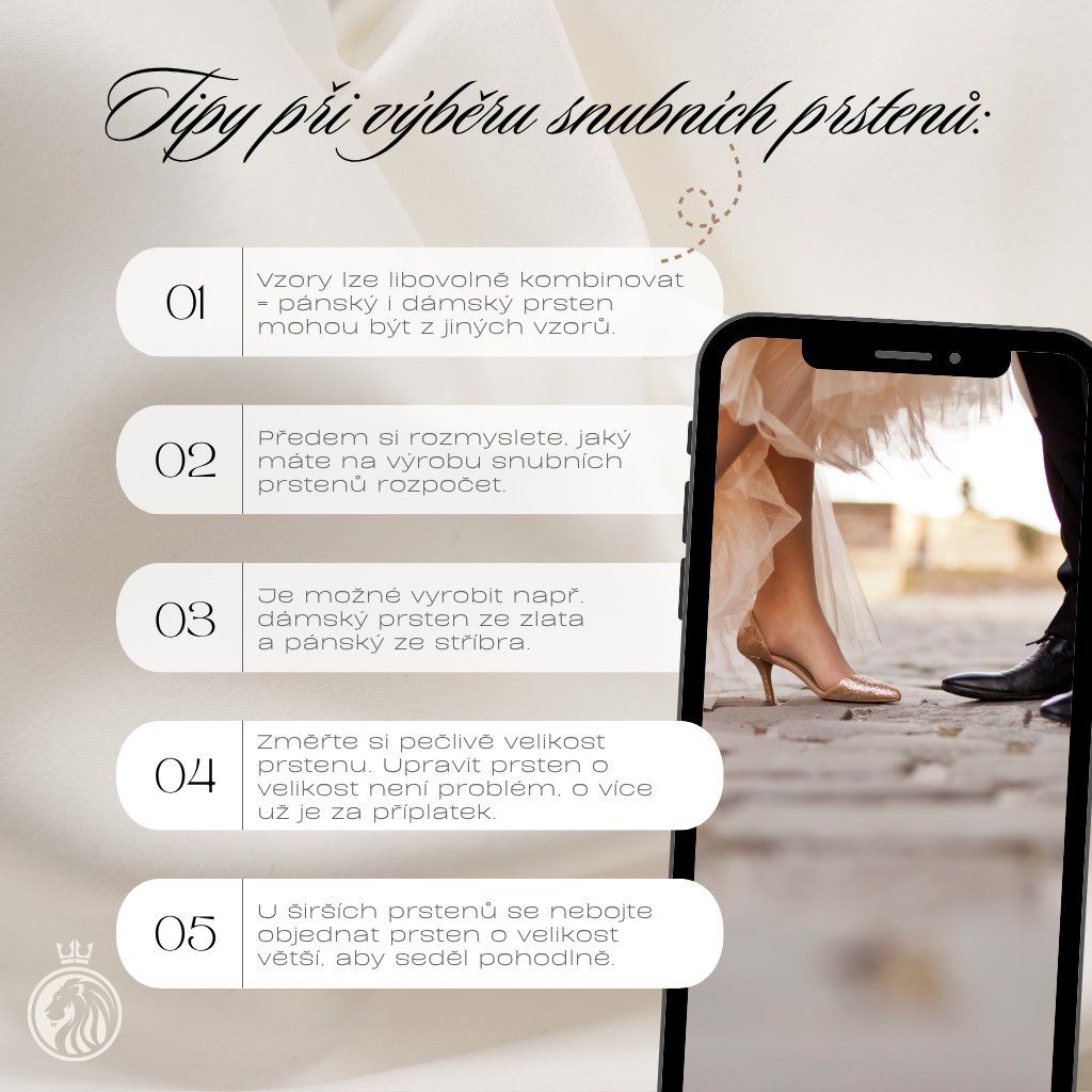Prsteny vám můžeme na vyžádání zdarma ozdobit vnitřní rytinou - například datem svatby nebo jmény novomanželů. V případě zájmu o rytinu napište prosím svůj požadavek do poznámky při zadávání objednávky v posledním kroku v pokladně. Děkujeme!