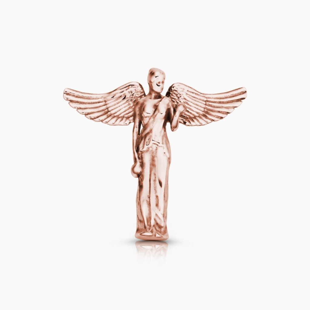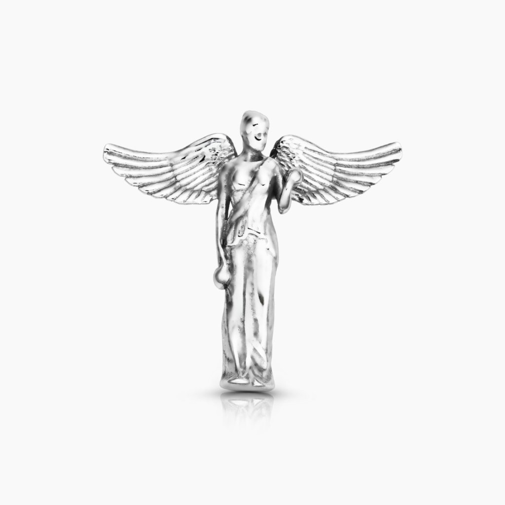 Trojrozměrný přívěsek ze šterlingového stříbra znázorňuje bohyni vítězství Niké, v klasickém rouchu a s roztaženými křídly.