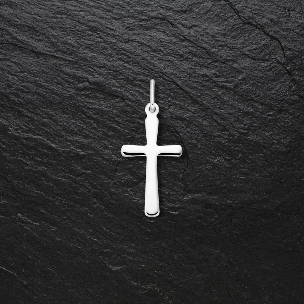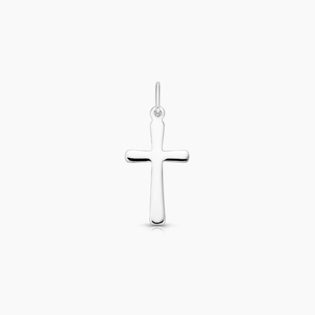 Drobný stříbrný přívěsek kříž v zaobleném, minimalistickém hladkém provedení.