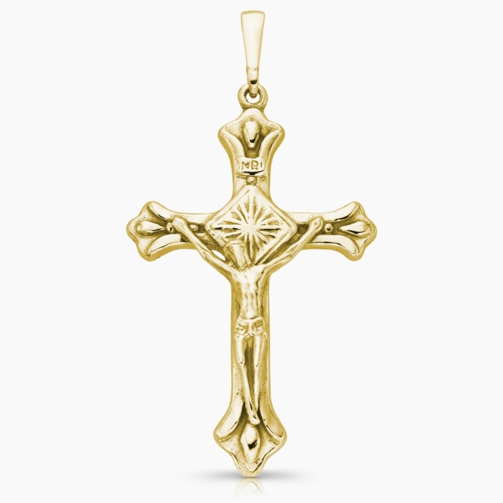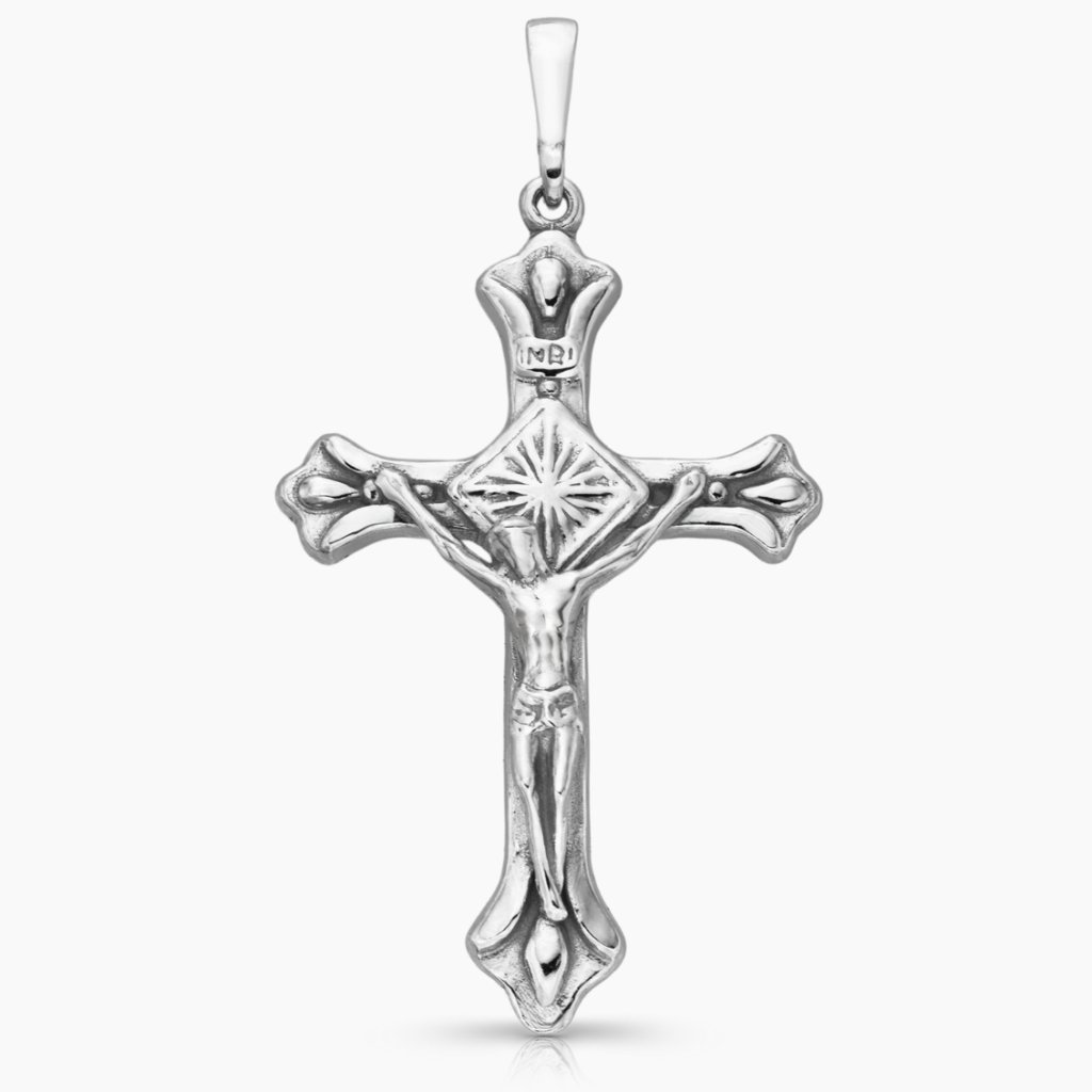 Větší, propracovaný unisexový stříbrný přívěšek ve tvaru kříže s Kristem a Božím okem.