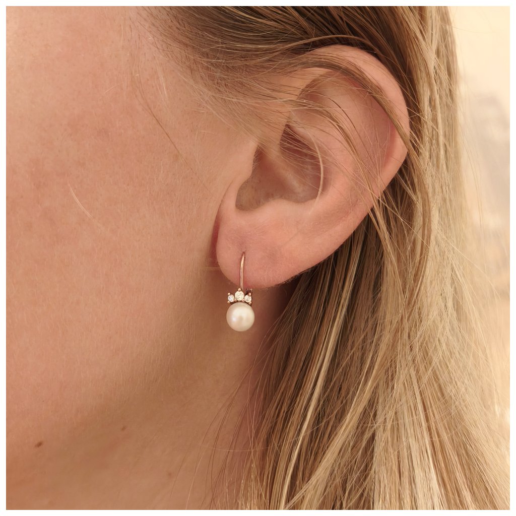 Elegantní, až pohádkové zlaté náušnice zdobené zirkony ve tvaru korunky a přírodními říčními perlami. S pohodlným zapínáním na klapku.