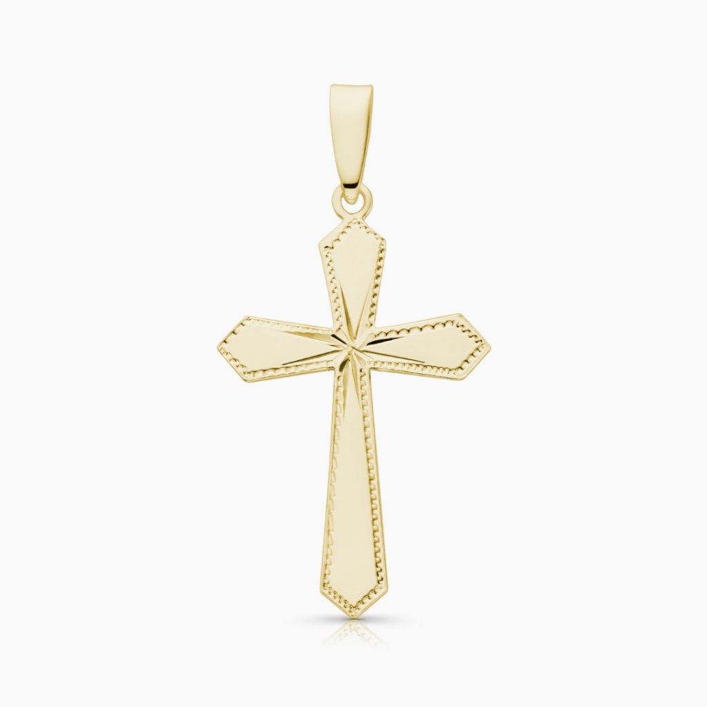 Unisex zlatý přívěsek v definovaném tvaru gotického kříže, zdobený ruční rytinou.