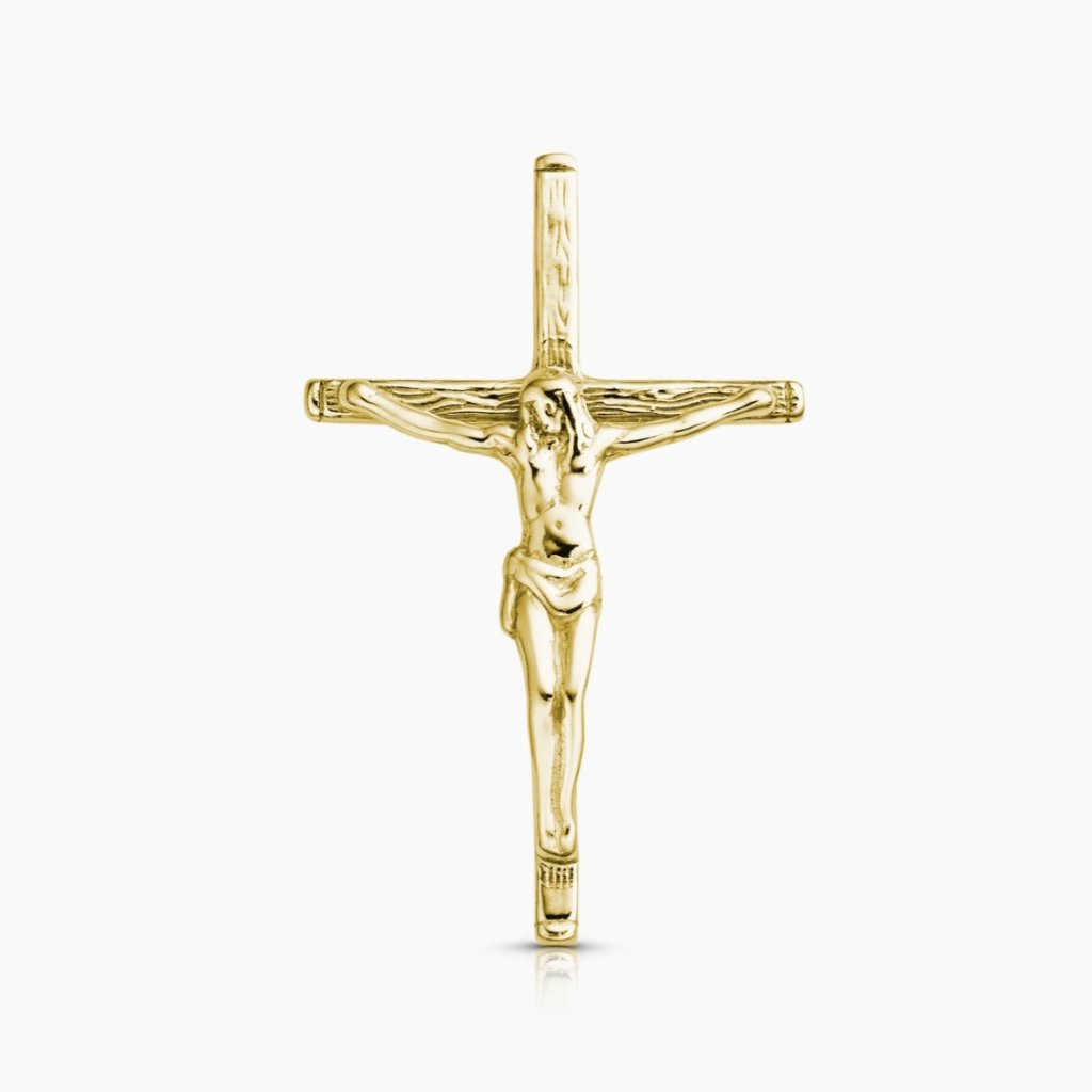 Propracovaný unisexový zlatý přívěšek ve tvaru Golgotského kříže s Kristem. Očko je skryté zezadu v horní části kříže, pro moderní sofistikovaný vzhled.