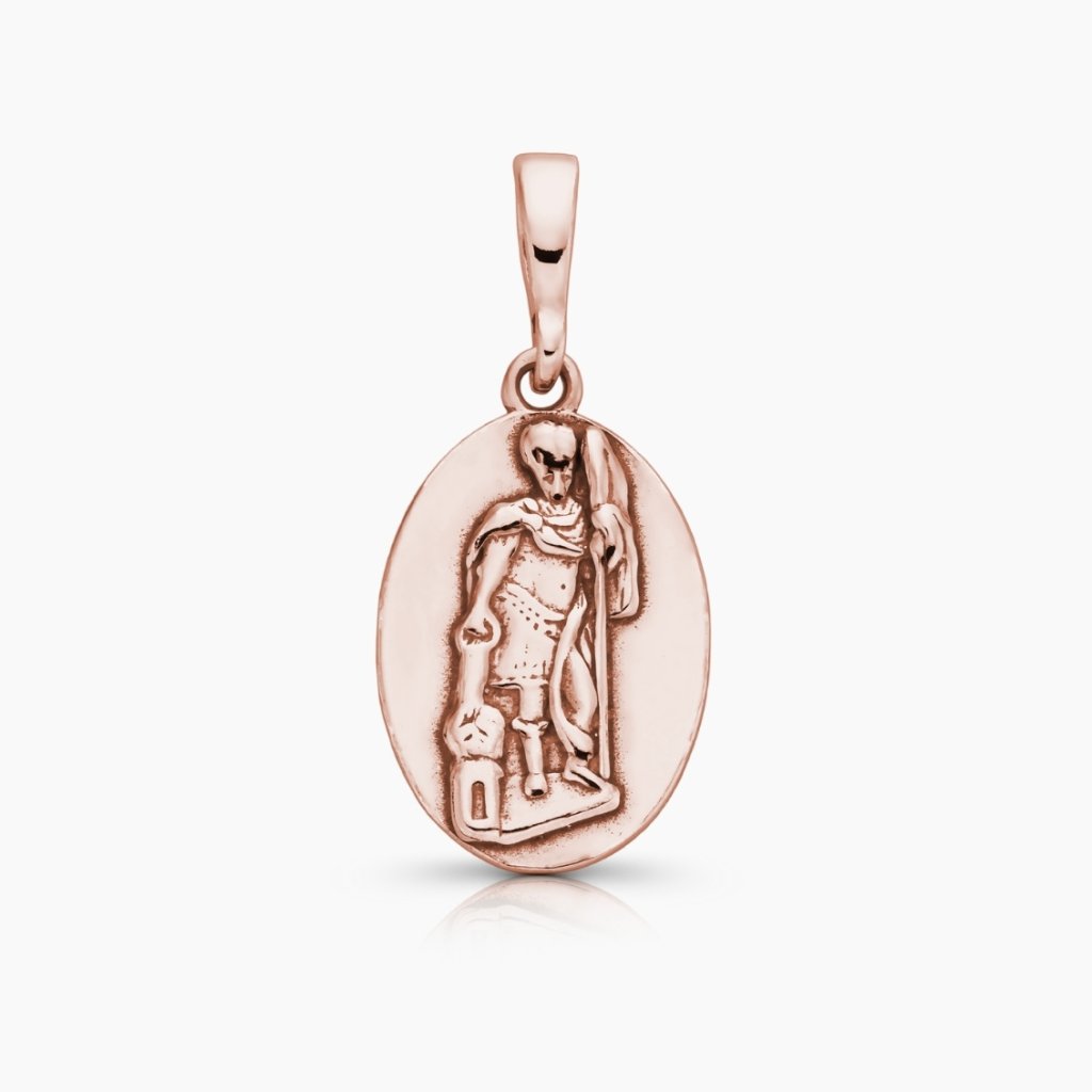 Oválný medailonek ze 14K zlata, který ve svém středu znázorňuje svatého Floriána, patrona všech hasičů, zedníků, kominíků a kovářů.